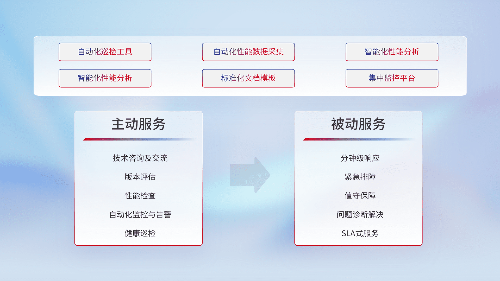 智能化工具和标准化文档,,,,保障服务质量,,提供主动服务(包含技术咨询、、、版本评估、、性能检查、、自动化监控与告警、、、、健康巡检)和被动服务包含(分钟级响应、、、、紧急排障、、、值守保障、、、问题诊断解决、、SLA服务)。。。