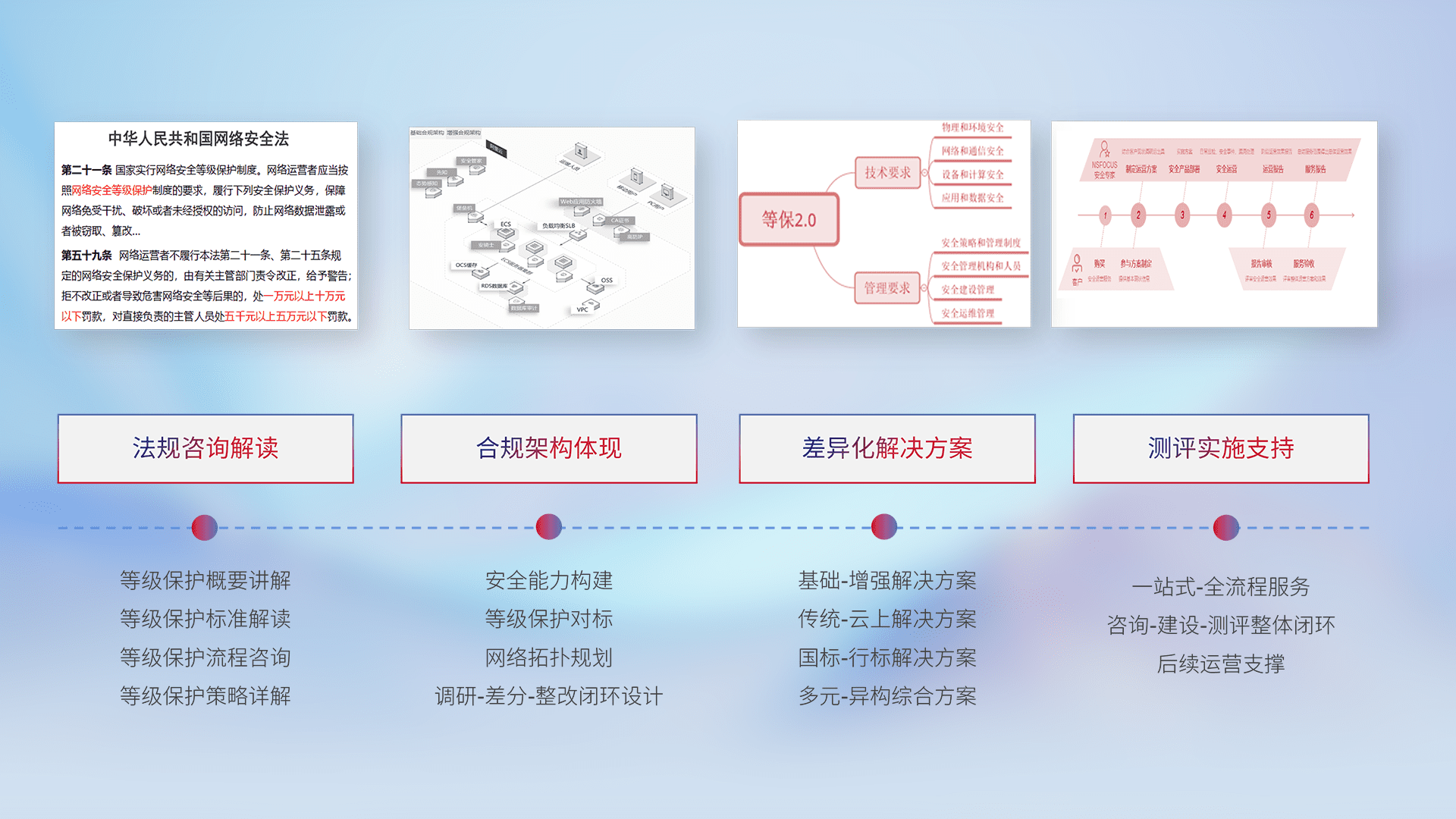 通过专业的法律咨询解读、、、合规架构体现、、差异化解决方案、、测试实施支持等服务,,为客户量身打造等保合规体系。。。